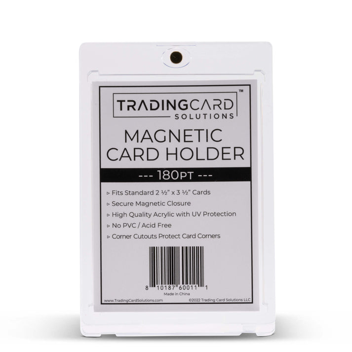 Display oversized collectible cards securely with the Trading Card Solutions Magnetic Card Holder – 180pt. Designed for heavyweight memorabilia cards like patch cards, multi-material signatures, or cards with game-used pieces, it fits up to 180pt thickness. The magnetic closure makes opening easy, and the crystal-clear acrylic with UV protection helps prevent fading and damage. PVC-free and acid-free, the archival-quality material ensures long-term preservation. Featuring precise recessed corners for edge protection, this holder offers both premium protection and standout presentation for your most valuable cards.