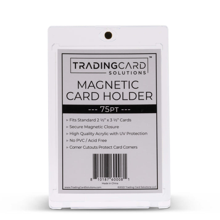 Secure and showcase your most collectible cards with the Trading Card Solutions Magnetic Card Holder – 75pt. This holder is engineered to fit standard‑size cards up to 75pt thickness, making it perfect for jersey cards, patch inserts, autographs, and other ultra‑thick memorabilia cards. It features a secure magnetic closure for easy access without tools, and is crafted from crystal-clear acrylic with UV protection to guard your cards from fading, dust, and scratches. The PVC‑free, acid‑free design offers archival-grade safety, and recessed, arrowhead-style corners help protect card edges. Ideal for sports collectors displaying high-value cards, this holder combines professional presentation with robust long-term preservation.