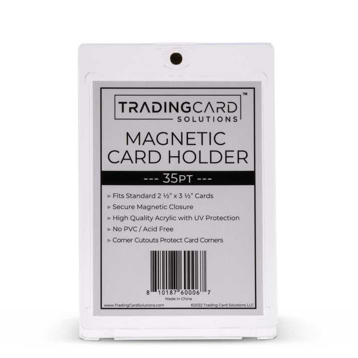 Protect and showcase your cards with the Trading Card Solutions Magnetic Card Holder – 35pt. This holder fits standard 2 ½ x 3 ½ inch trading cards and features a secure magnetic closure for quick and easy access without tools or screws. Made from high-quality acrylic with UV protection, it guards against harmful light, dust, and scratches while keeping your cards in pristine condition. The PVC-free, acid-free construction is archival safe, and the corner cutouts help prevent damage to card edges. Perfect for sports cards, Pokémon, Magic: The Gathering, and other collectible cards, this holder combines professional presentation with reliable protection.