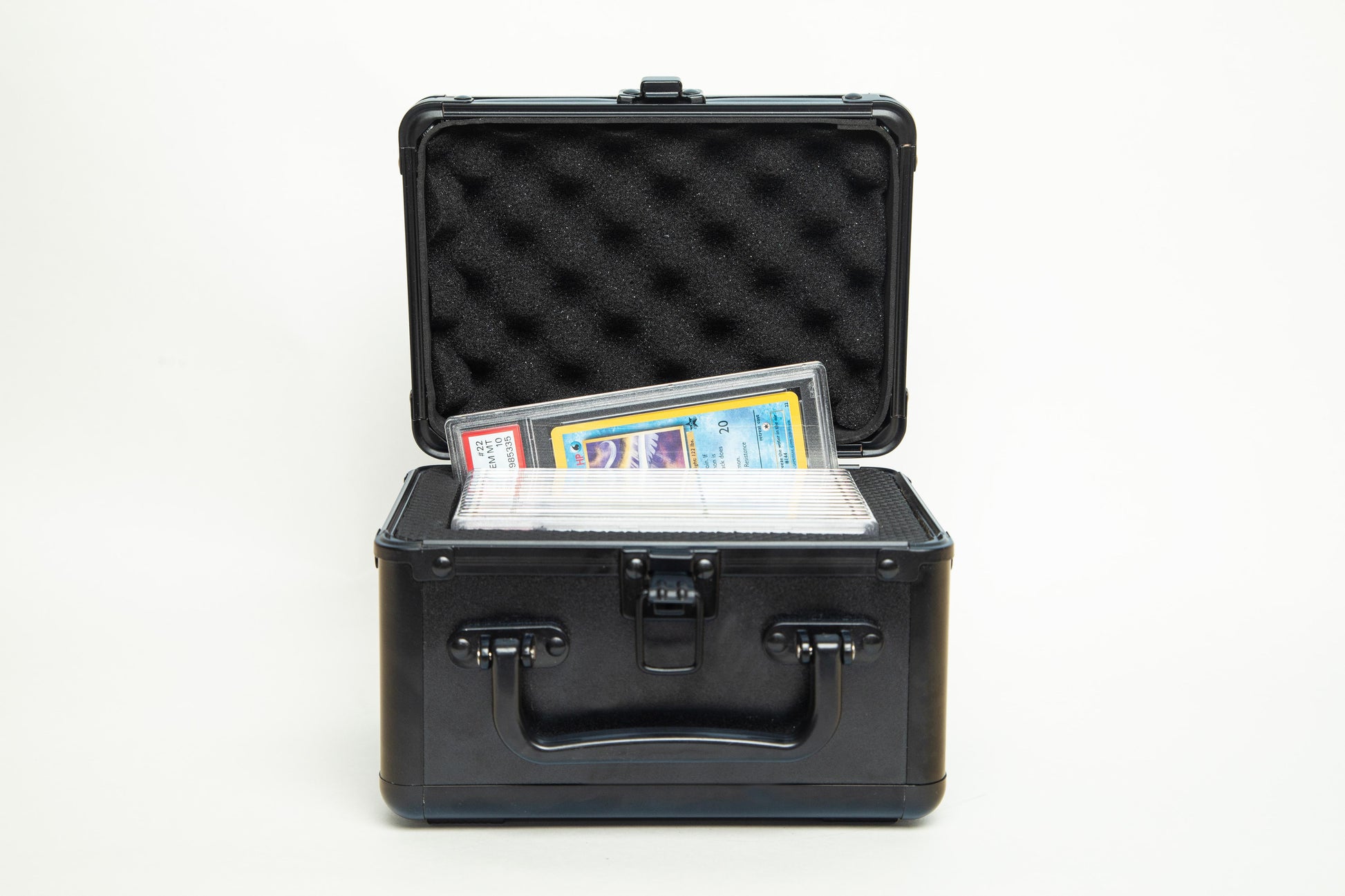 Designed to fit graded trading cards from PSA, TAG, CGC, BGS, SGC, AGS, and HGA, this compact case can also accommodate one-touch holders, semi-rigids, and top loaders. The rugged "orange peel" textured shell, paired with a strong, ergonomic handle and a single-latch locking mechanism, makes it ideal for travel and everyday use.