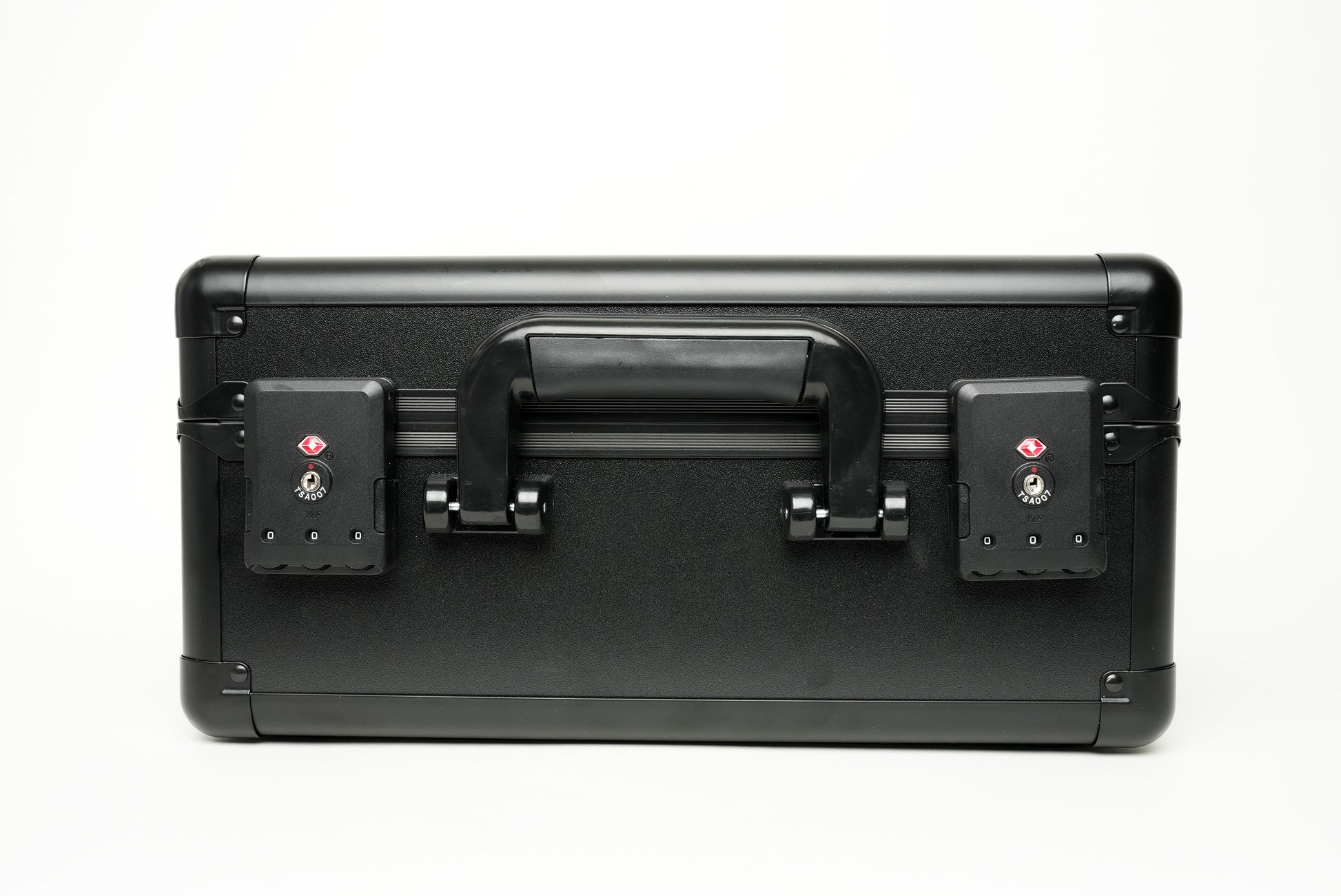 The case features dual customizable combination locks and TSA key access, making it both airline-friendly and highly secure. A strong, ergonomic carry handle ensures all-day comfort, while the rugged “orange peel” textured exterior adds grip and visual appeal.